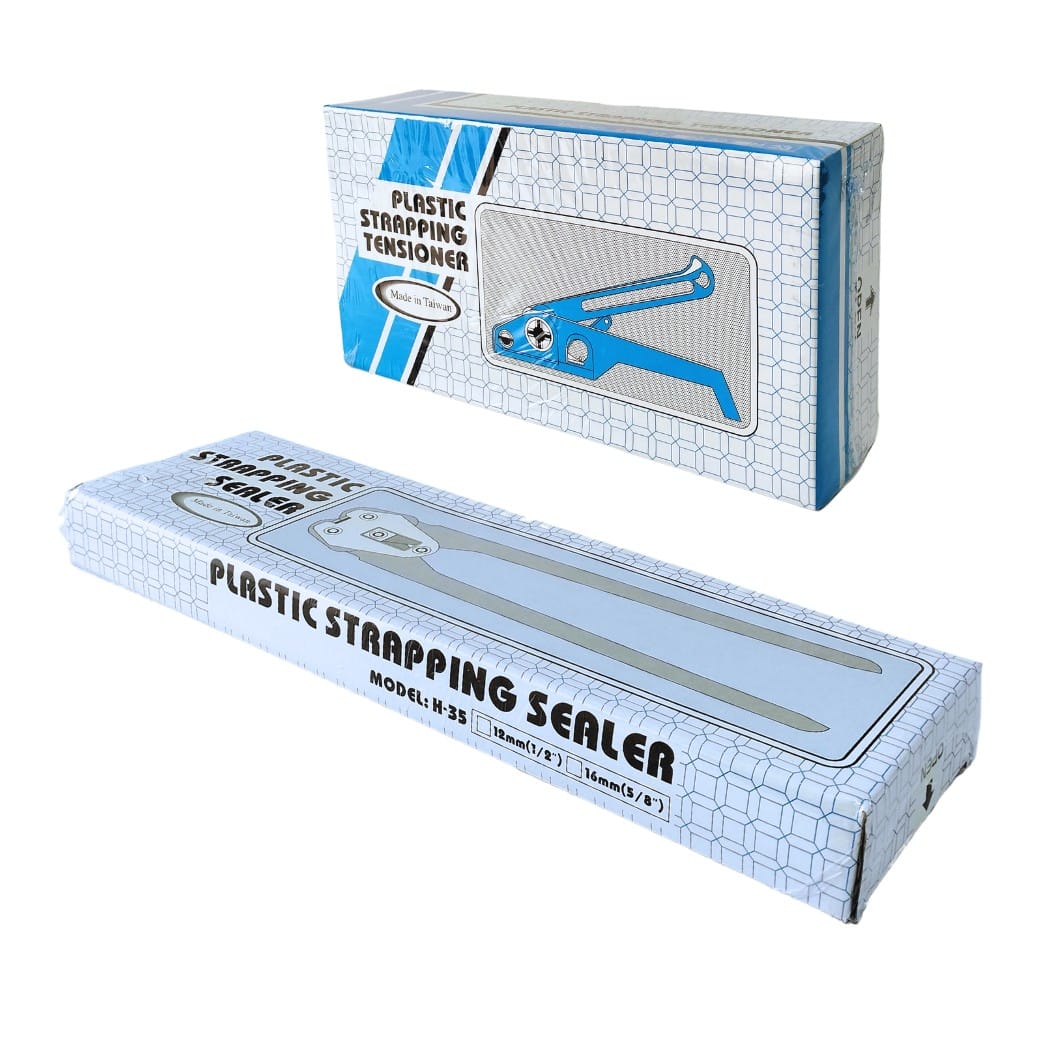 Máquina enzunchadora manual de color azul compuesta tanto por el tensionador como la tenaza para emplearlo en zunchos plásticos de distintas presentaciones.