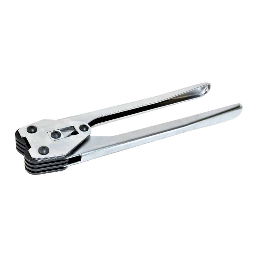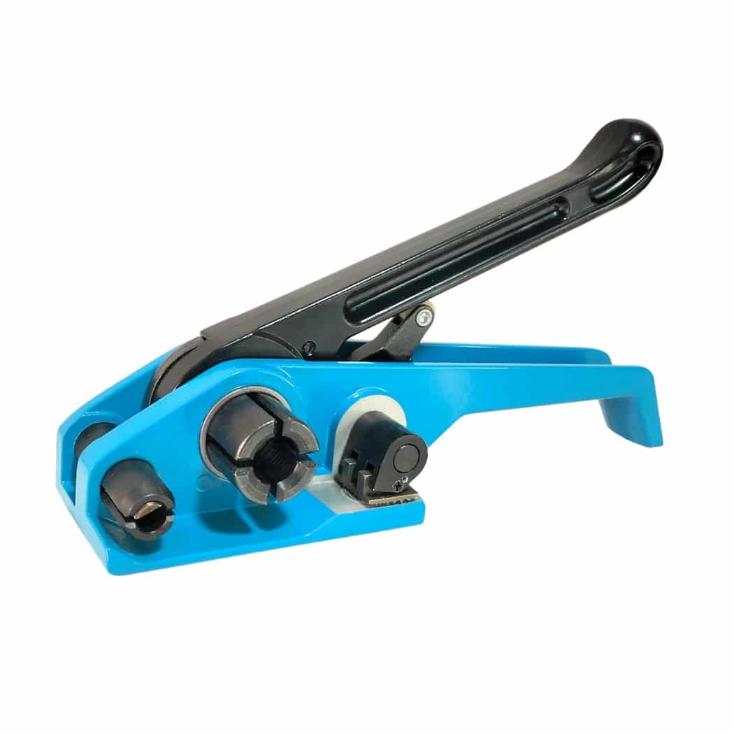 Máquina enzunchadora manual de color azul compuesta tanto por el tensionador como la tenaza para emplearlo en zunchos plásticos de 1/2″, 5/8″ y 3/4″.