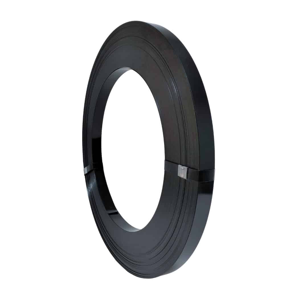 Fleje o zuncho metálico fabricado en acero con recubrimiento negro, diseñado para brindar máxima resistencia y seguridad en el embalaje de cargas pesadas. Su alta firmeza lo hace ideal para fijaciones permanentes en sectores industriales exigentes como la minera, construcción,  o metalúrgica.
