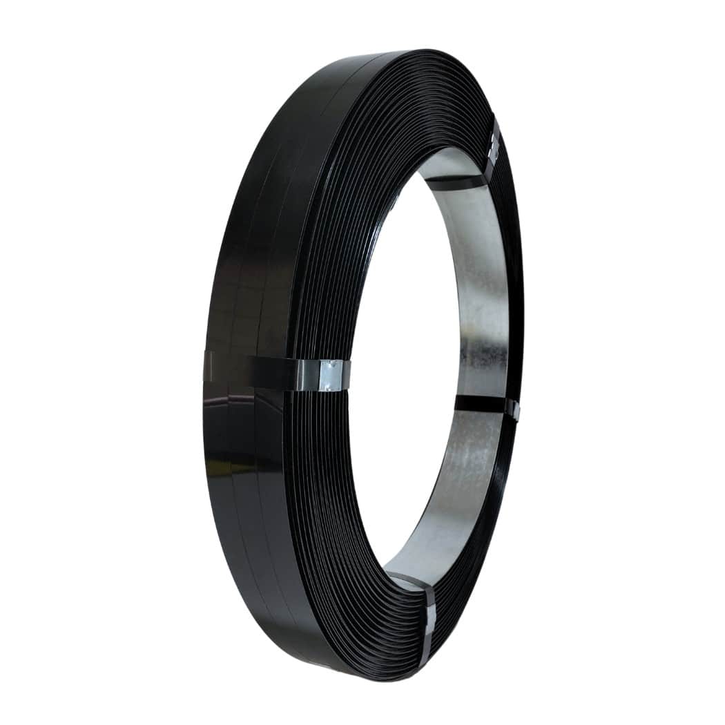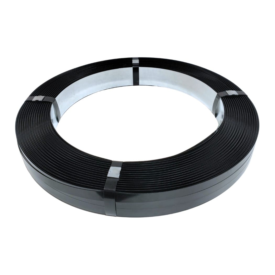 Fleje o zuncho metálico fabricado en acero con recubrimiento negro, diseñado para brindar máxima resistencia y seguridad en el embalaje de cargas pesadas. Su alta firmeza lo hace ideal para fijaciones permanentes en sectores industriales exigentes como la minera, construcción, metalúrgica y marítima.